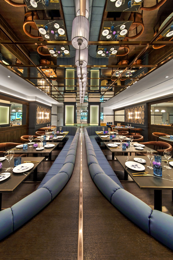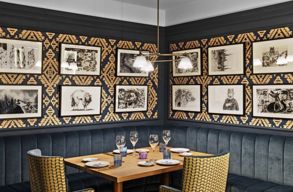 Pero pasemos a la decoración, que es lo que nos ocupa, y descubramos el maravilloso mundo años 20 que ha recreado el estudio Rockwell. Comencemos por el restaurante LOBO 8. Se ha diseñado un espacio clásico que recuerda tiempos pasados. Predomina la madera que le confiere calidez, junto con el terciopelo azul pavo real y el cuero en las butacas. Un ambiente relajado y sofisticado a la vez para un espacio que promete convertirse en un must de la noche madrileña.
