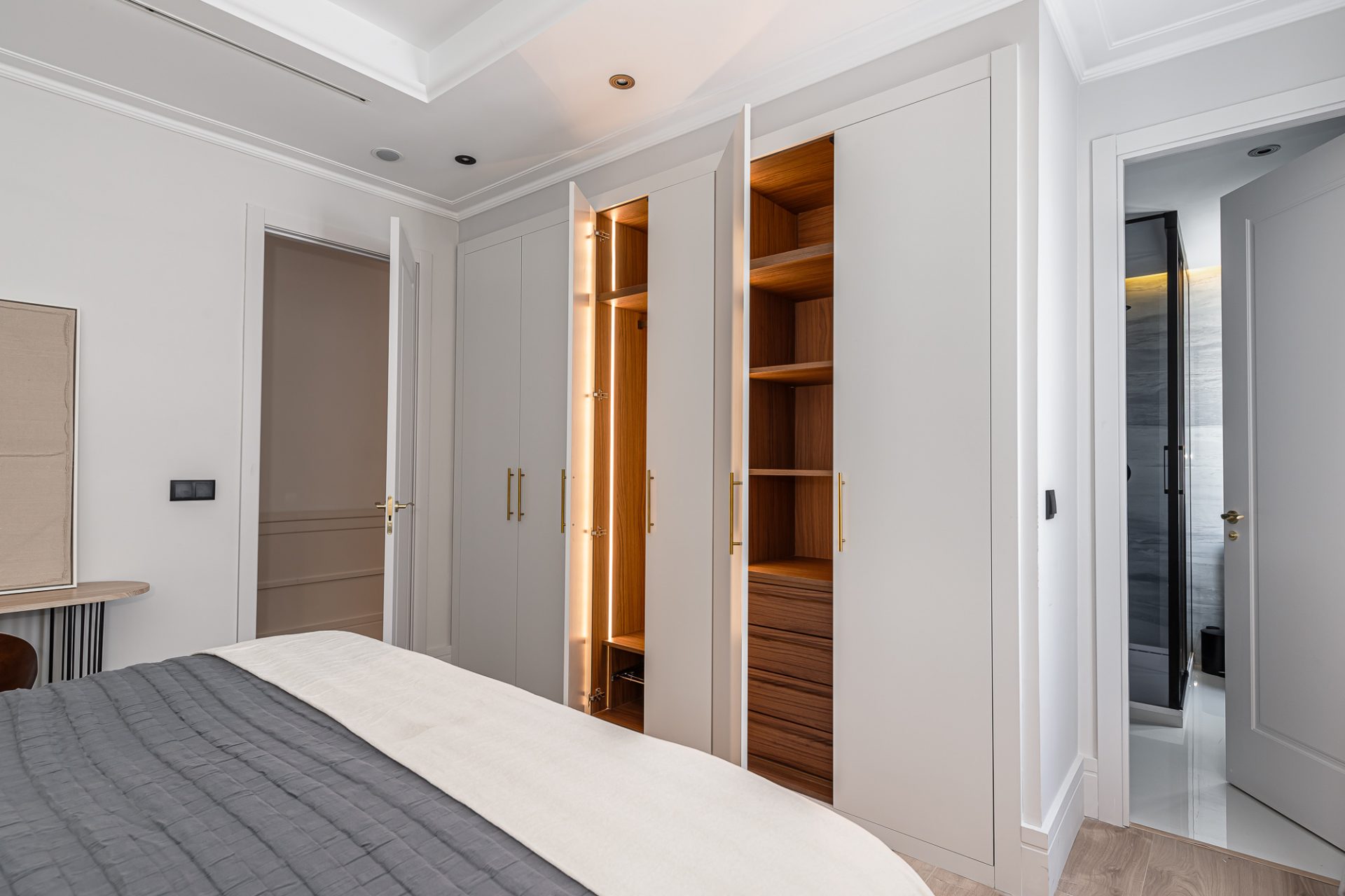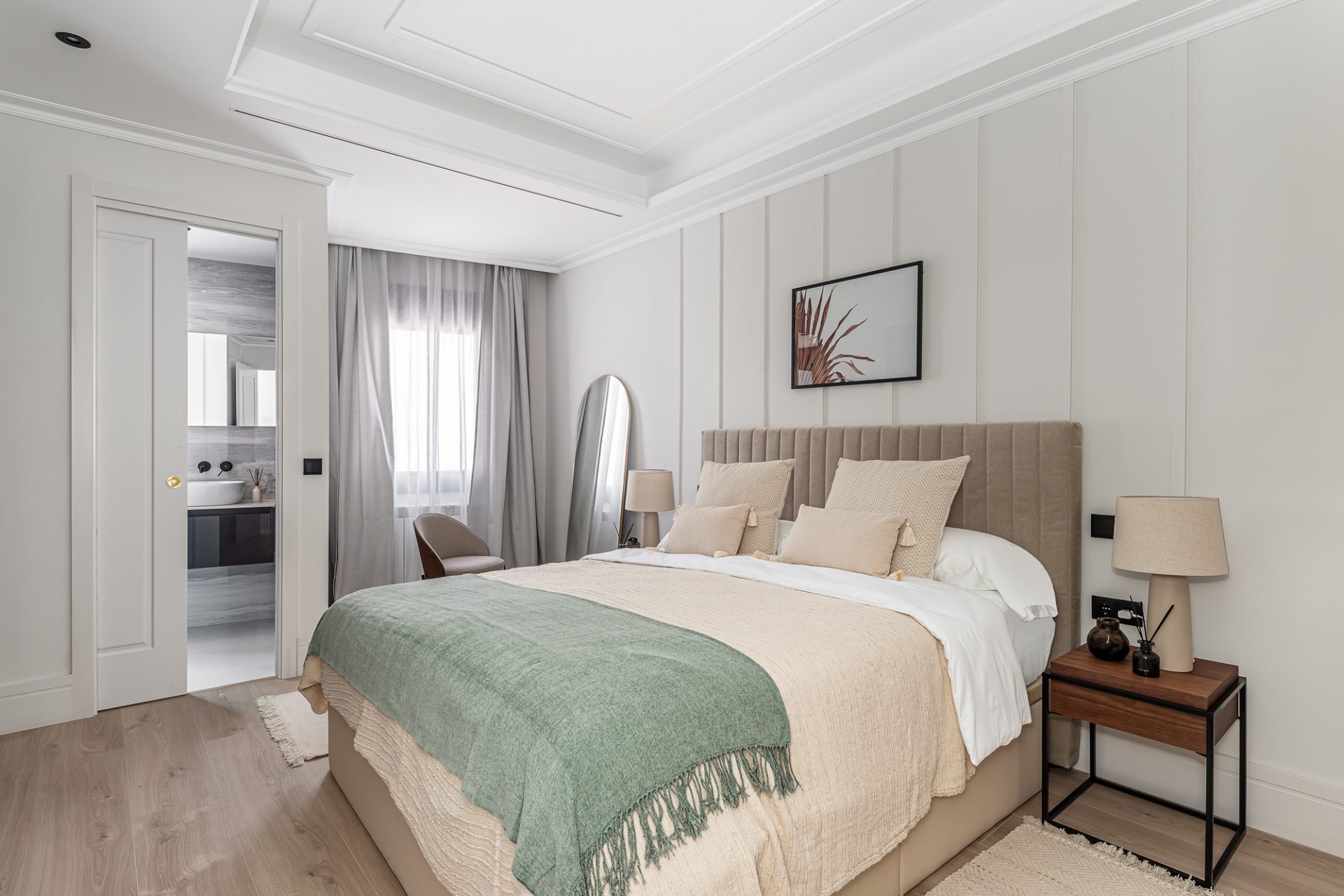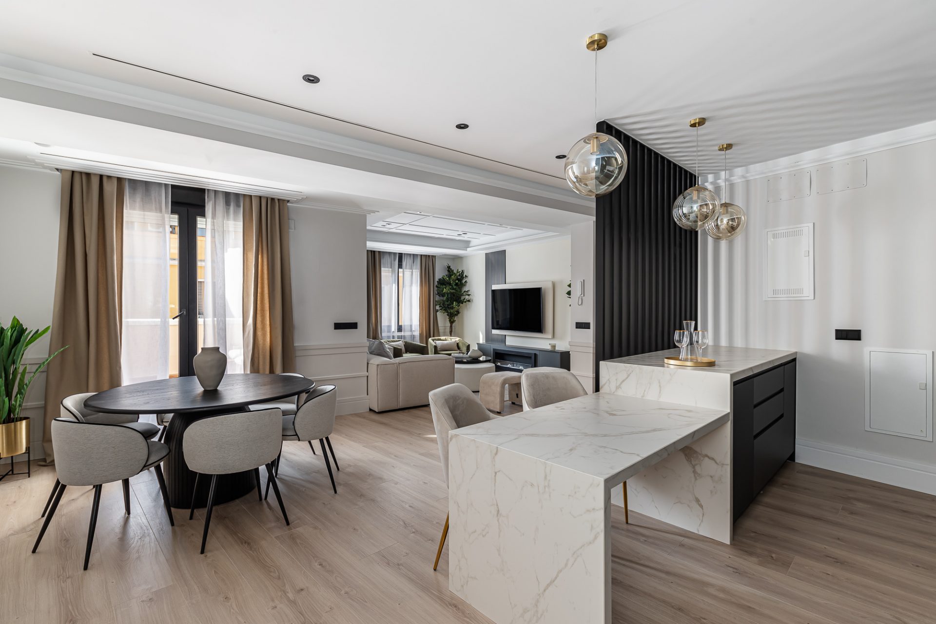 El ático, distribuido en tres amplias habitaciones y cuatro baños, ha sido reformado con los más altos estándares, utilizando materiales de lujo y acabados modernos que realzan cada espacio. Su diseño optimizado ofrece amplias zonas sociales bañadas por luz natural, gracias a su altura y orientación privilegiada, que permite disfrutar de vistas despejadas del cielo de Madrid.