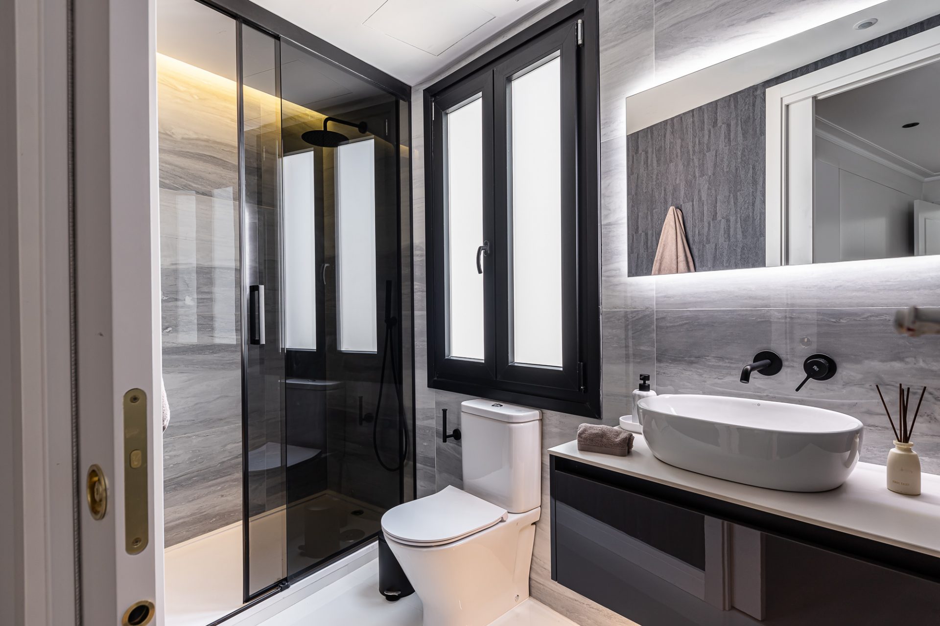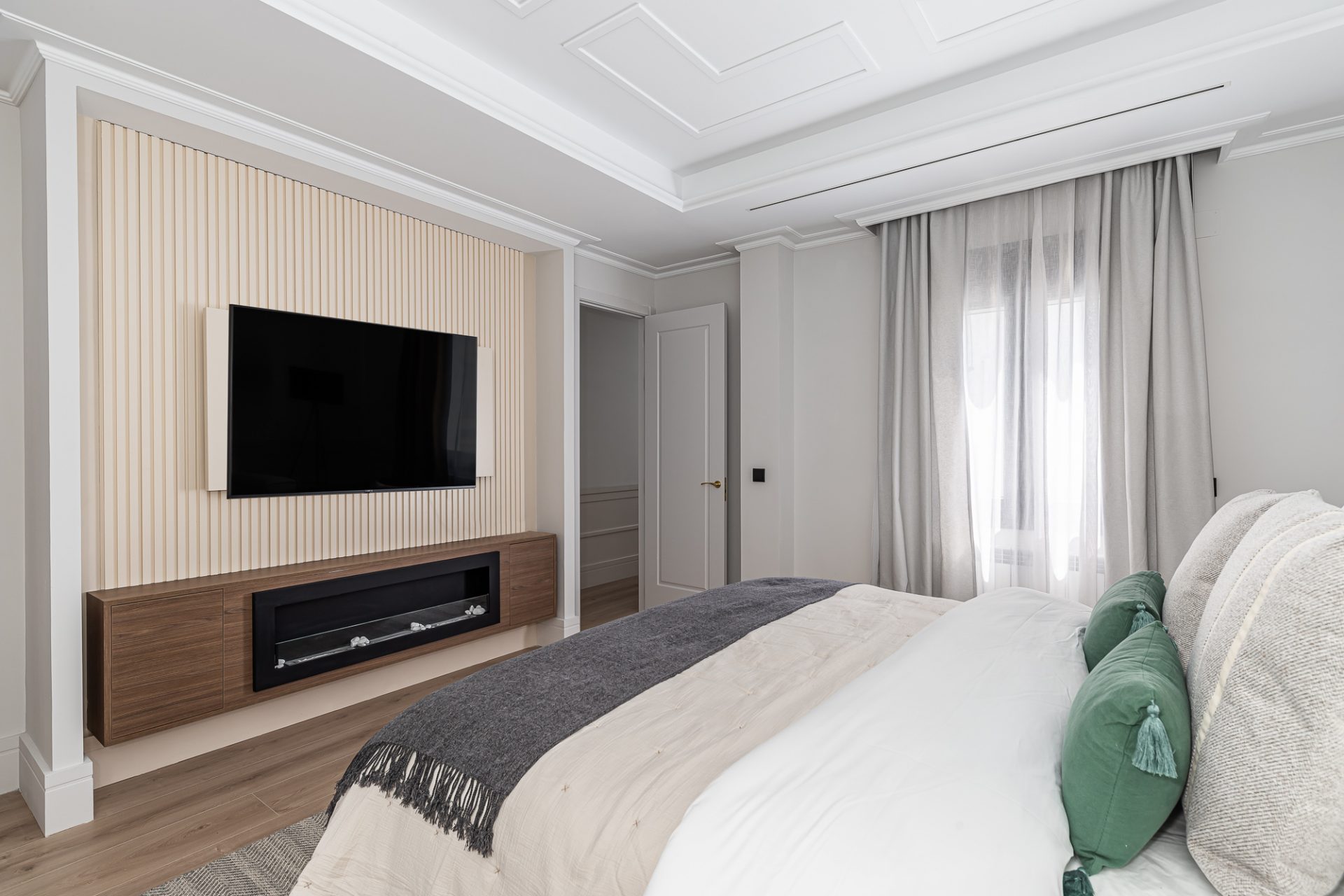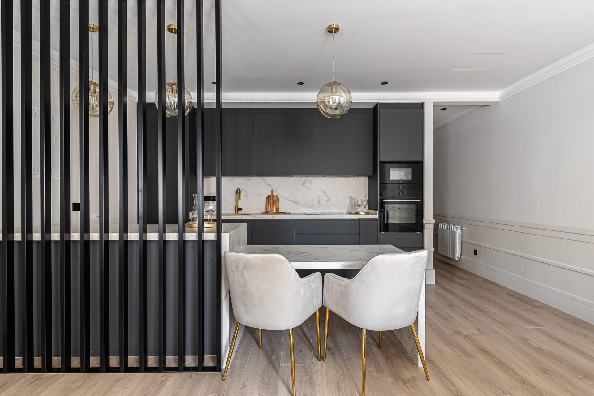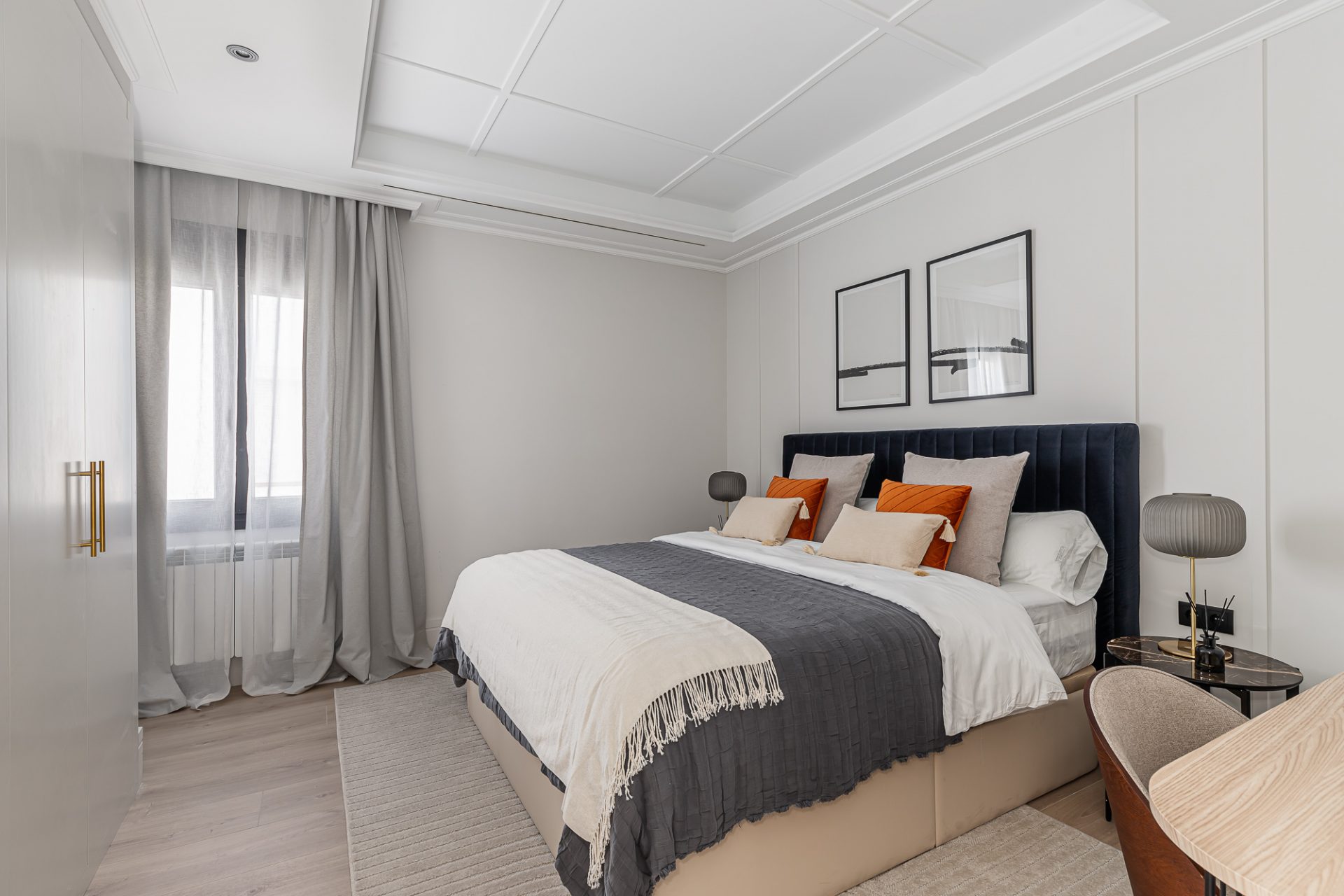 El ático, distribuido en tres amplias habitaciones y cuatro baños, ha sido reformado con los más altos estándares, utilizando materiales de lujo y acabados modernos que realzan cada espacio. Su diseño optimizado ofrece amplias zonas sociales bañadas por luz natural, gracias a su altura y orientación privilegiada, que permite disfrutar de vistas despejadas del cielo de Madrid.