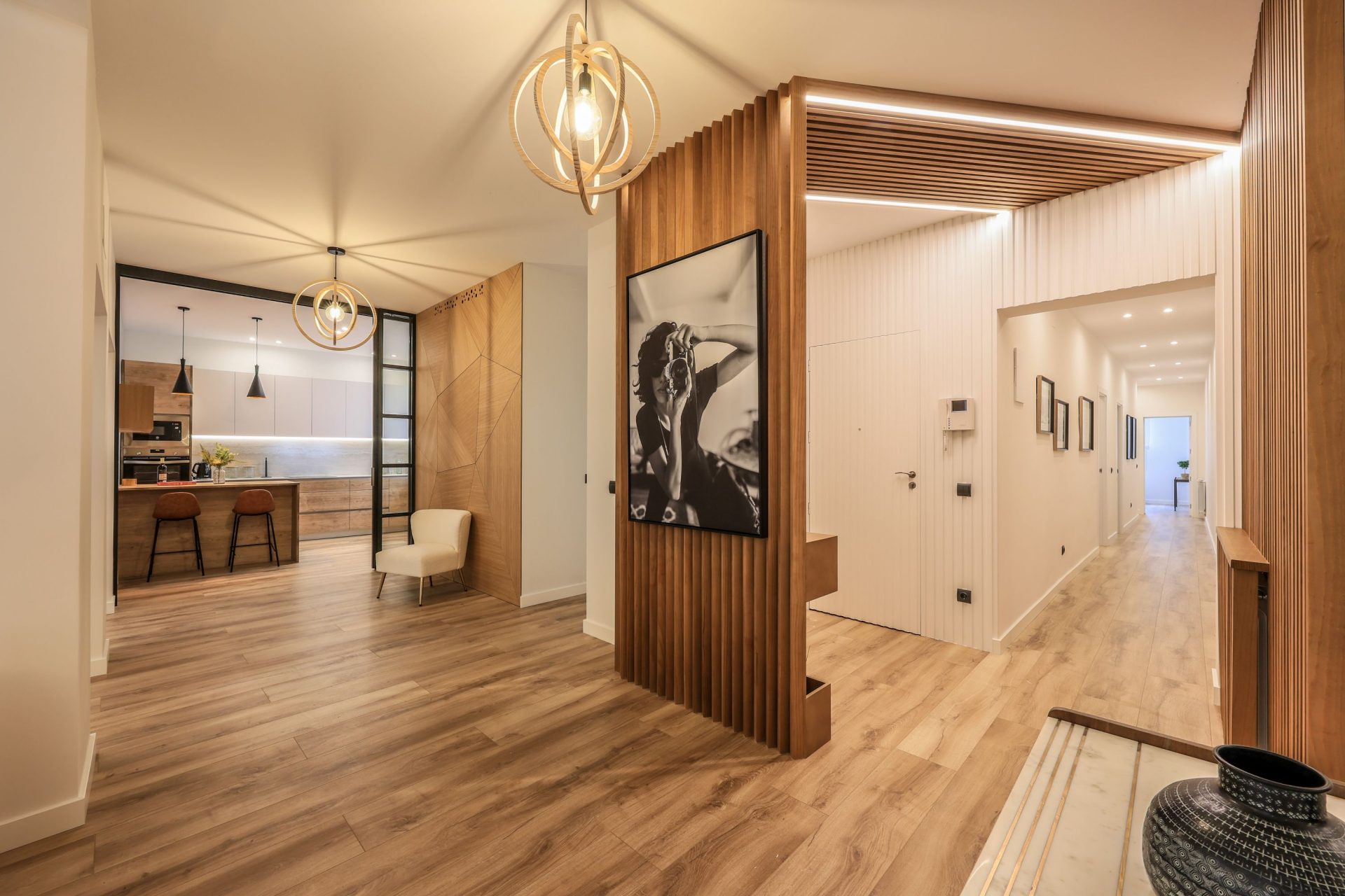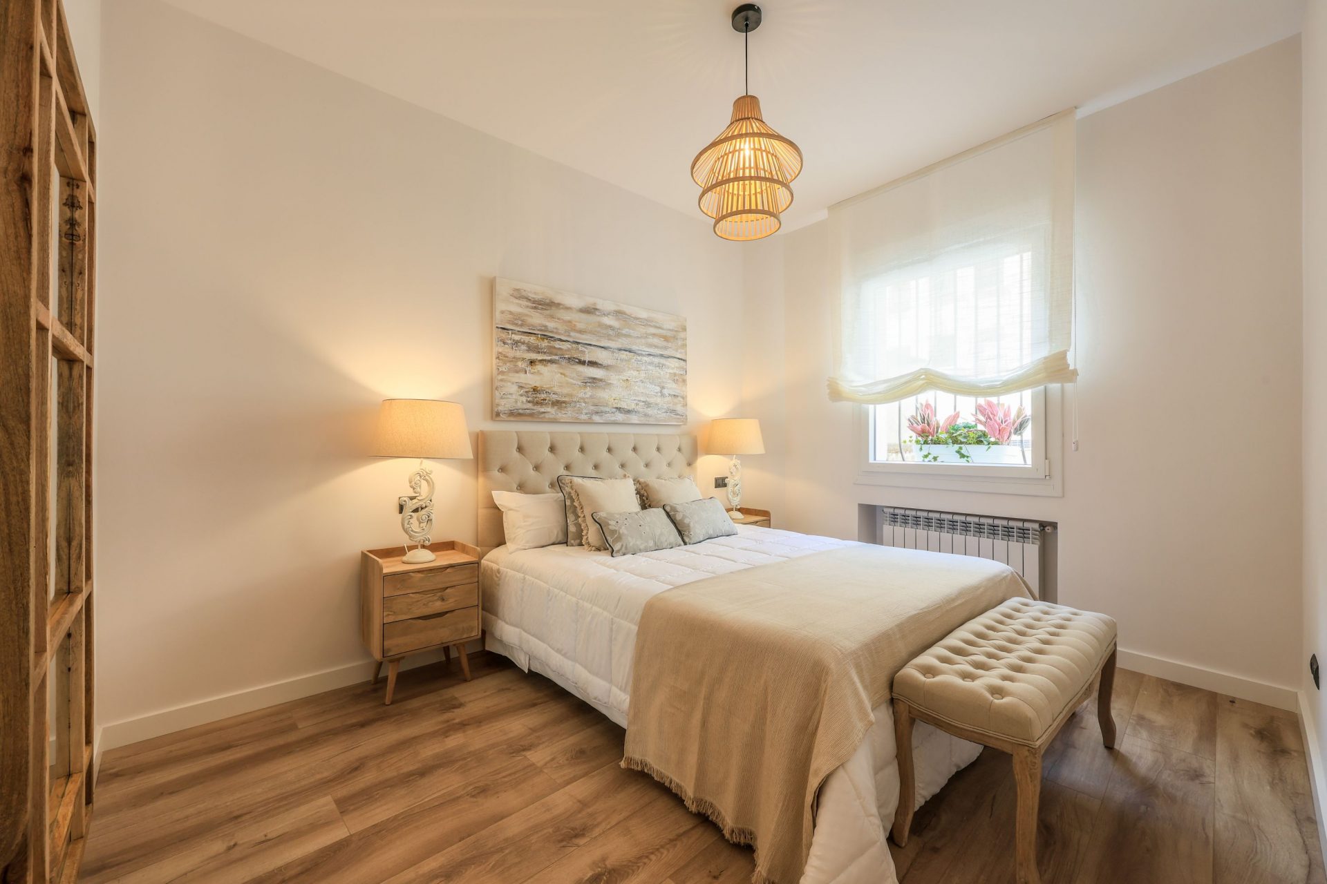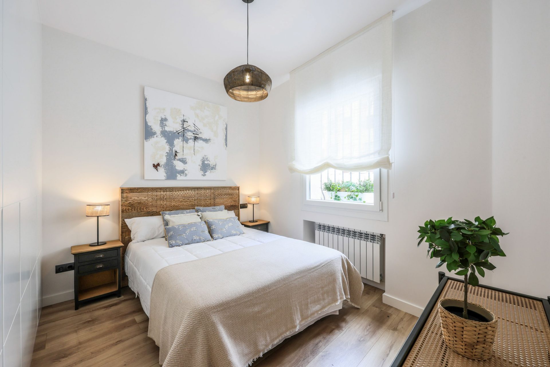 El suelo es de tarima flotante AC5 en dormitorios, pasillos, salón, comedor y cocina. La grifería es monomando de alta gama, lacada en negro.