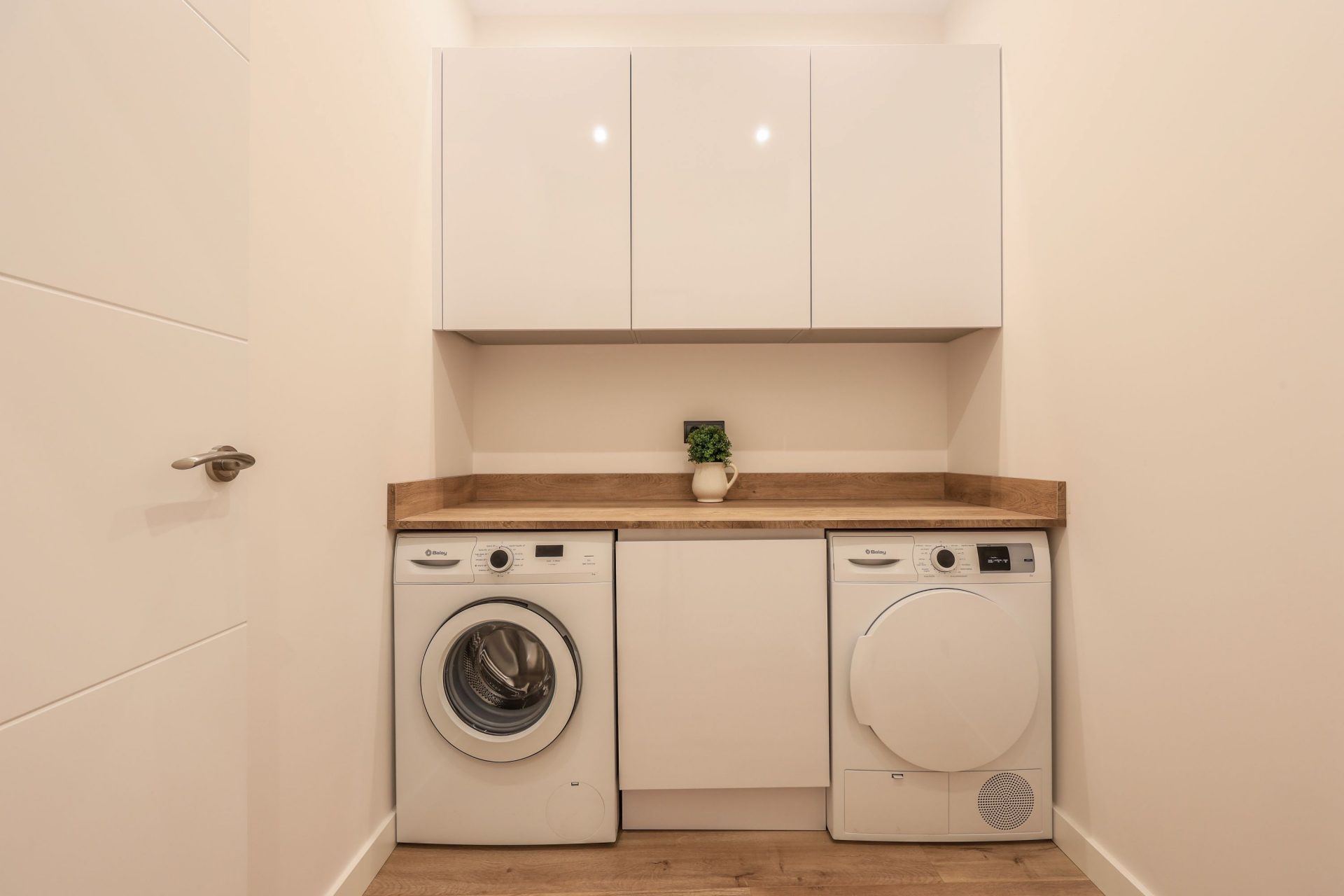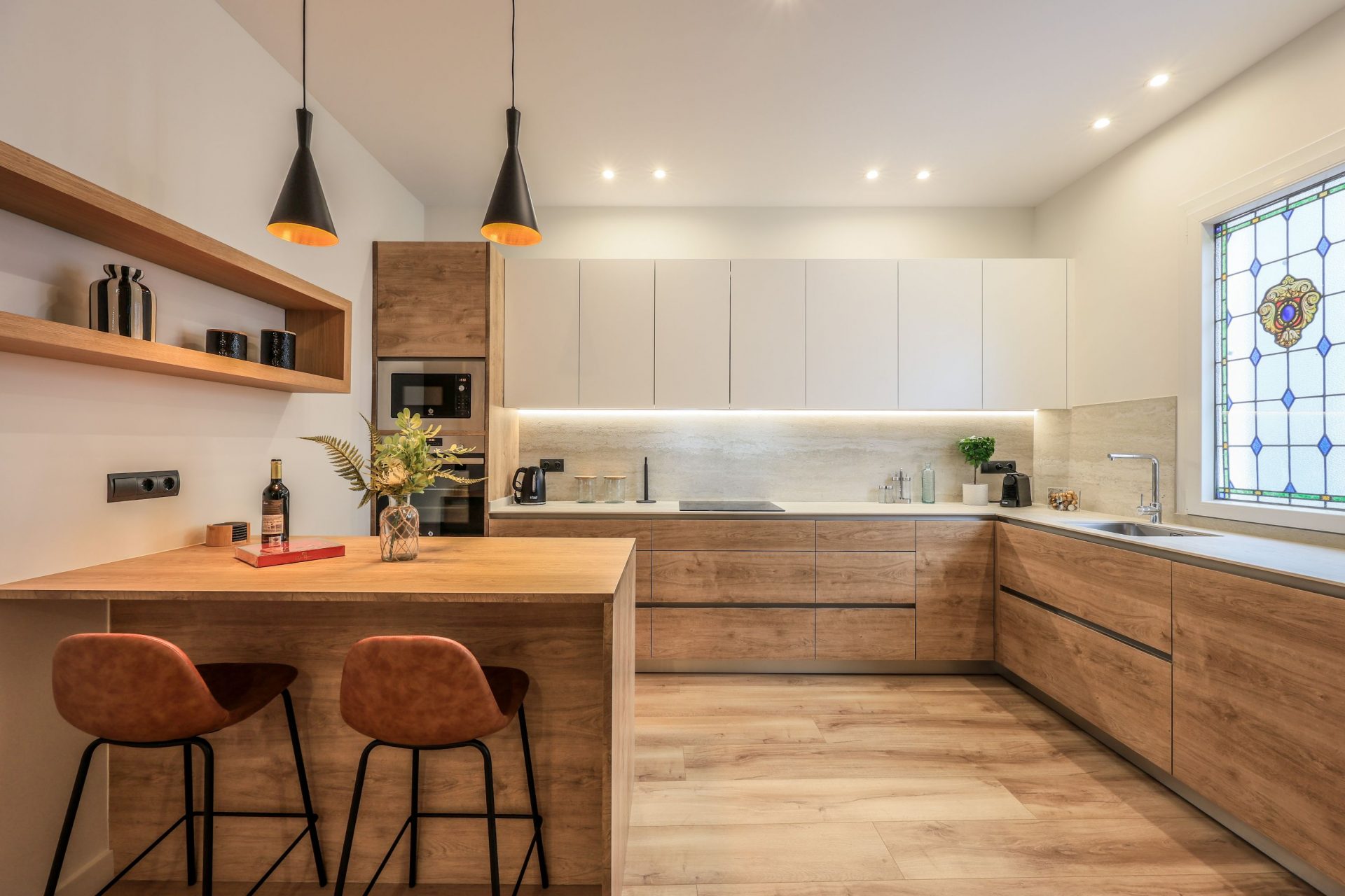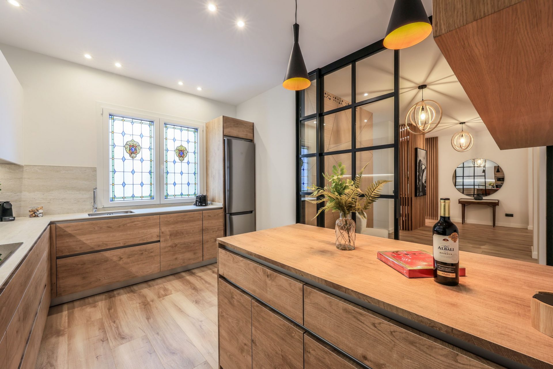 La cocina está equipada con electrodomésticos de alta gama, y a su vez, dispone de una cristalera corredera que permite tanto integrarla al salón, como independizarla.