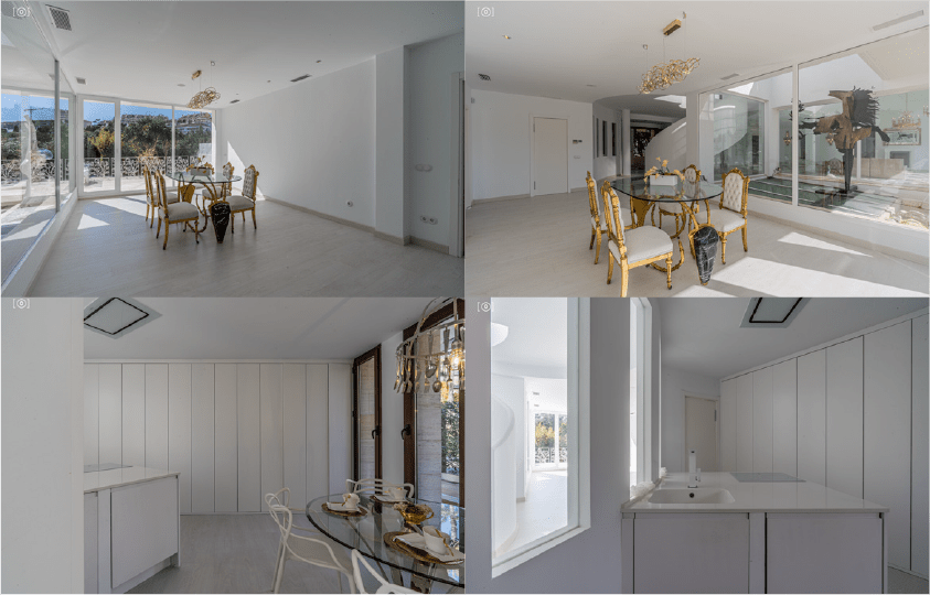 La villa tiene una superficie construida de 744 m2 en 3 plantas. Planta Baja: Enorme salón comedor con enormes cristaleras que comunican a una terraza con vistas al jardín y a la piscina. También en esta planta nos encontramos con la Master Suite de 52m2 con baño/vestidor y sala de estar. Completan esta planta un aseo de cortesía, funcional cocina de 20 m2 completamente amueblada y con todos los electrodomésticos (Lavadora, frigorífico, lavavajillas, placa vitrocerámica, campana extractora, horno y microondas) y una pequeña capilla.