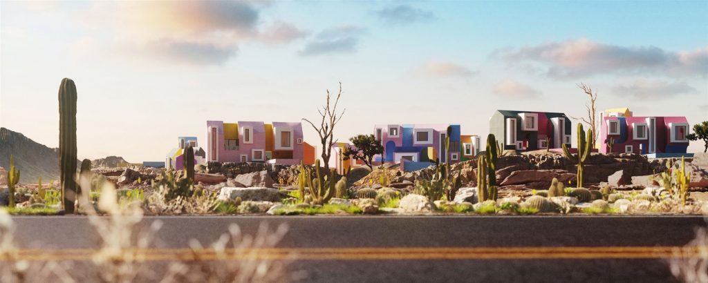 En este sentido, cada casa de Sonora Art Village no es solo un espacio para huéspedes, sino que es una escultura. Por ello, no existe un sistema claro del proyecto, sino que las casas están ubicadas caóticamente, cada una con su propio tamaño y combinación de colores, algunas distintas al rosa y el amarillo.
